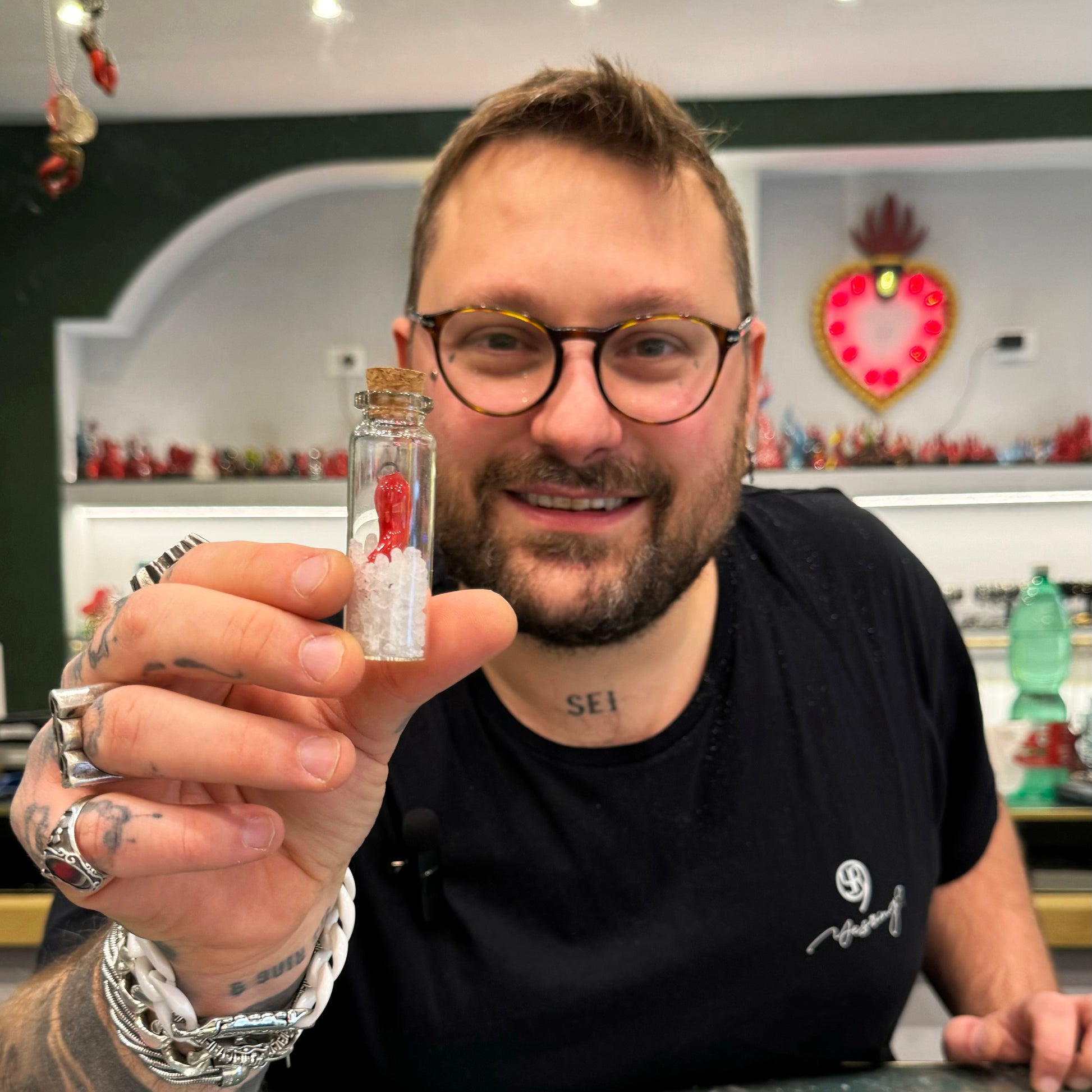 Il cornetto sotto sale è un mix di energie, un kit completo in una boccetta di vetro. Il sale da gettare alle spalle, come vuole la tradizione napoletana, elimina le energie negative e facilita il lavoro al cornetto in ceramica, potente amuleto porta fortuna da poter portare con sè in ogni occasione!